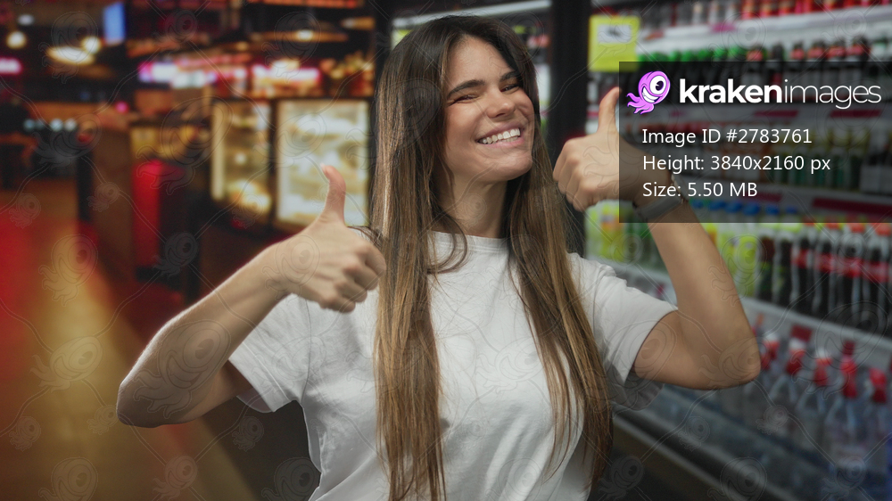 Woman smiling gives thumbs up in a vibrant indoor cafe, showcasing happiness and positivity with a background of colorful bottles and a warm restaurant ambiance. - Kraken Images