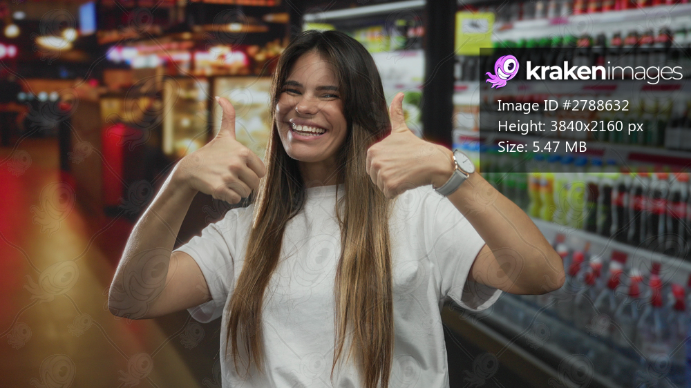Woman smiling gives thumbs up in a vibrant indoor cafe, showcasing happiness and positivity with a background of colorful bottles and a warm restaurant ambiance. - Kraken Images