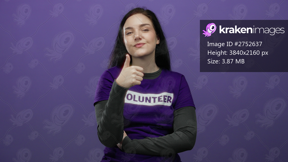 Woman smiling gives thumbs up in purple volunteer shirt against vibrant purple background showcasing positive community involvement and encouragement.