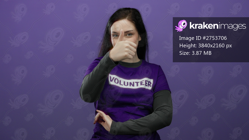 Woman smiling gives thumbs up in purple volunteer shirt against vibrant purple background showcasing positive community involvement and encouragement.