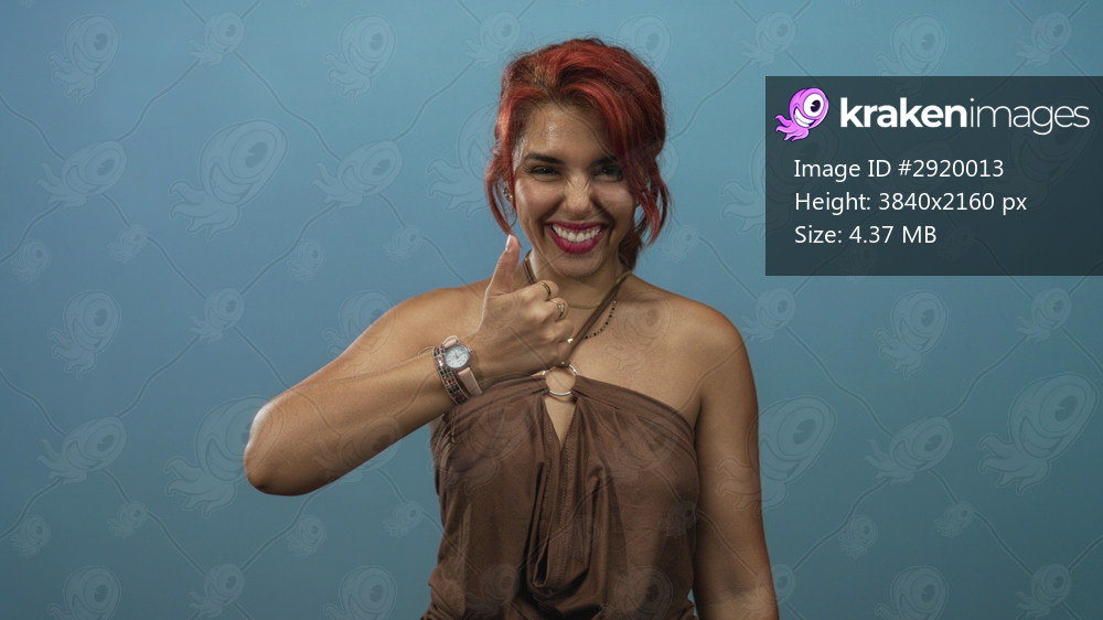Woman smiling and giving a thumbs up in a blue studio with exposed shoulder and red hair, wearing bracelets and a watch; confidence joy.