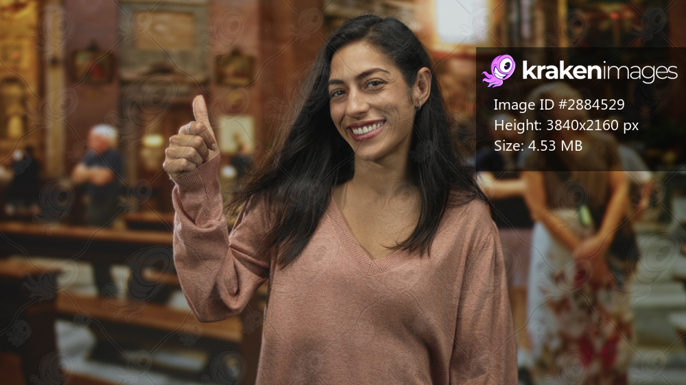Woman smiling and giving a thumbs up with visible thumb and hand inside ornate catholic church building among pews and visitors; serenity.