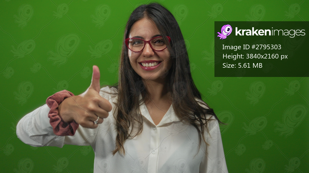 Woman smiling and giving thumbs up against isolated green background wearing glasses and white shirt showing positivity and approval.