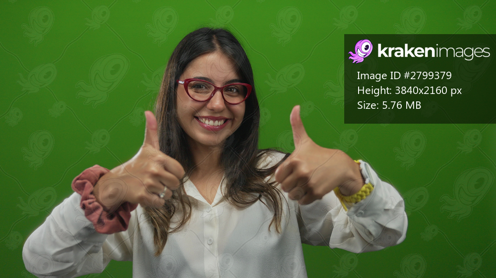 Woman smiling and giving thumbs up against isolated green background wearing glasses and white shirt showing positivity and approval.