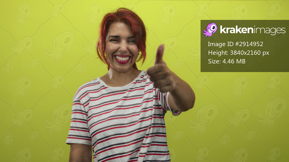 Woman smiling and giving thumbs up with her right hand in studio lime green wall wearing striped shirt; joy confidence.