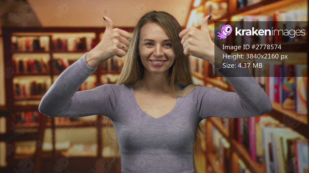 Woman smiling and giving thumbs up in a library with bookshelves behind, creating a joyful and positive atmosphere in a bright indoor setting.