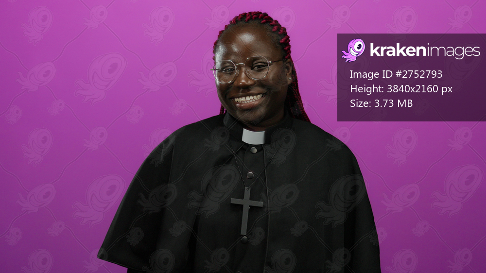 Woman smiling and giving thumbs up in black clerical outfit against vibrant pink background, exuding positivity and confidence.