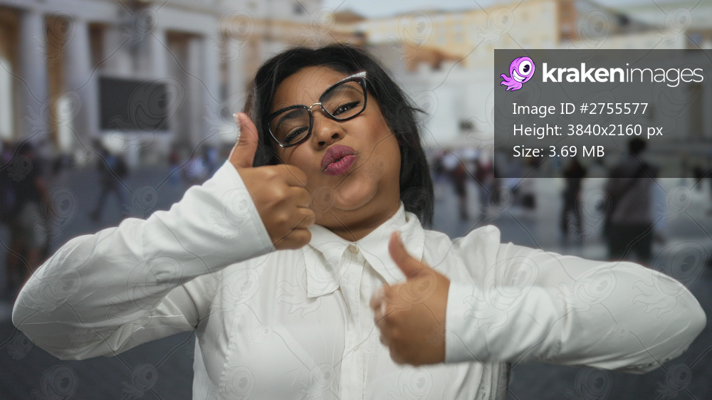 Woman smiling and giving thumbs up in bustling vatican city square, showcasing a joyful moment in iconic european setting with diverse tourists and historic architecture backdrop. - Kraken Images
