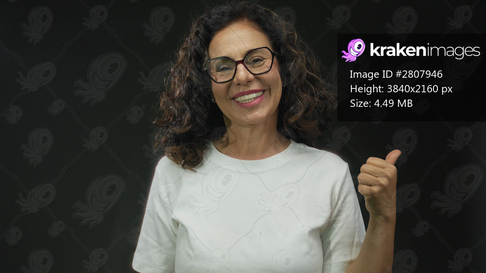 Woman smiling giving thumbs up in white shirt against dark background with curly hair glasses joyful confident isolated happy positive confident cheerful middle-aged hispanic - Kraken Images