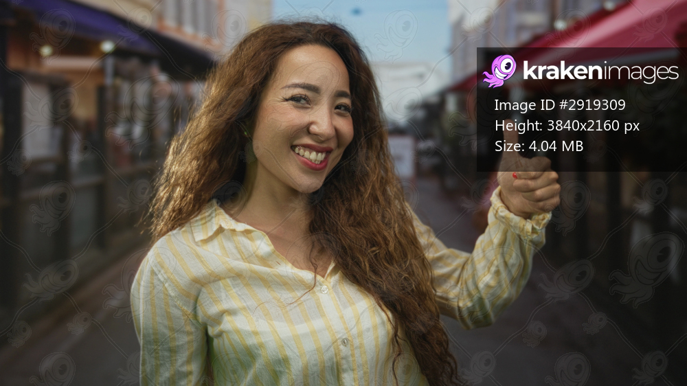 Woman smiling and giving thumbs up on a narrow street market, long curly hair and yellow striped shirt, looking toward camera; approval joy optimism.