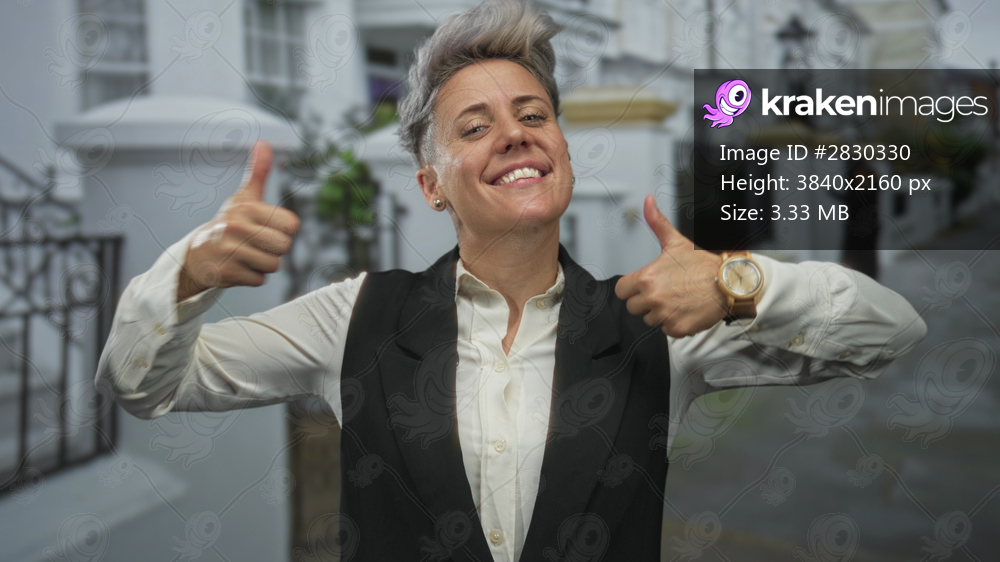 Woman smiling and giving thumbs up on bustling street lined with white terraced buildings; approval positivity.