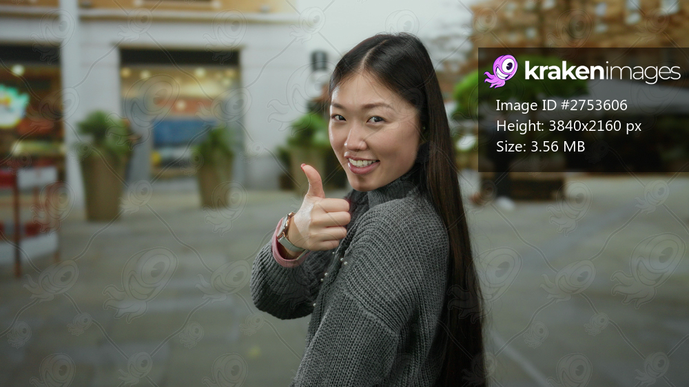Woman smiling and giving thumbs up on city street with urban backdrop and modern buildings highlighting a lively urban environment with greenery.