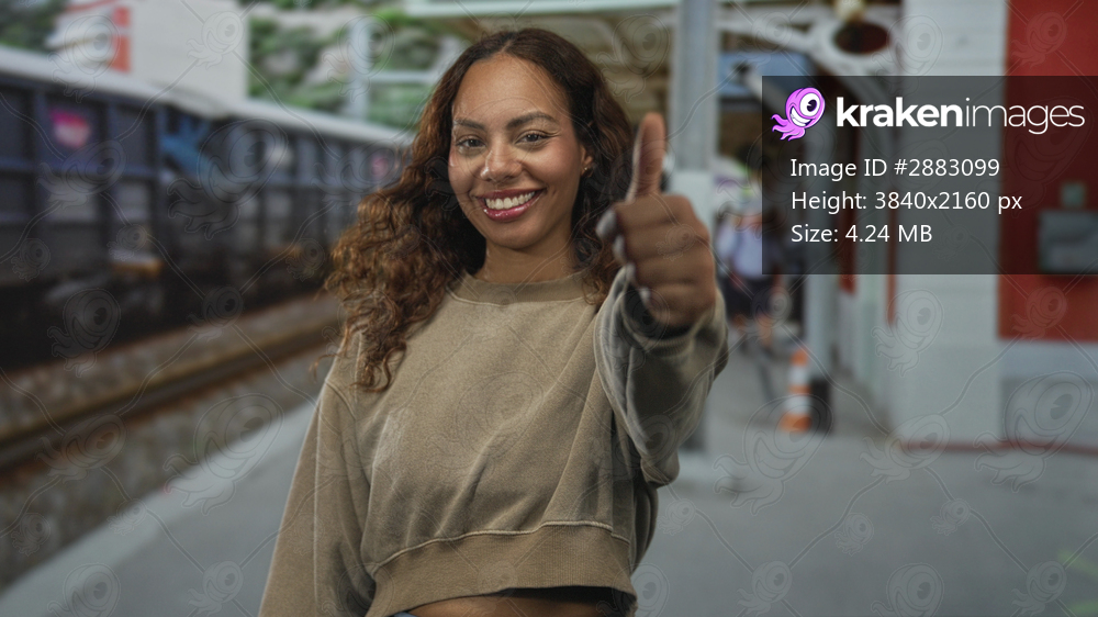 Woman smiling and giving thumbs up and thumbs down while standing on train station platform beside a freight railcar; approval optimism.