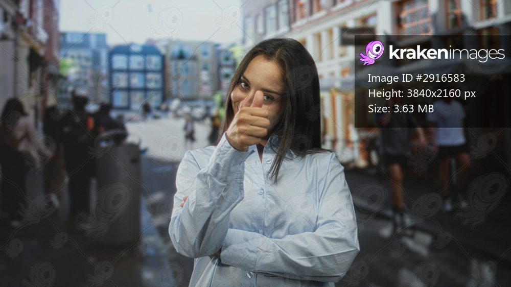 Woman smiling and giving thumbs up while standing with crossed arms on a busy city street among pedestrians and storefronts; confidence ambition success. - Kraken Images