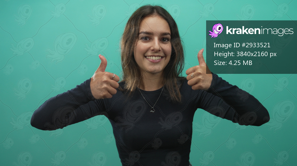 Woman smiling and giving two thumbs up in a teal studio setting, front lit and wearing a heart pendant; approval.