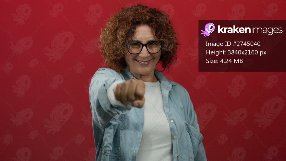 Woman smiling with glasses and curly hair shows her fist against a vivid red wall, wearing denim with a confident expression and bright energy.