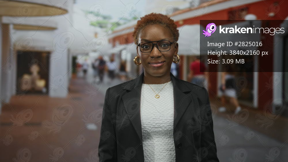 Woman smiling with glasses and gold earrings stands before storefronts on a street under daylight; calm confidence.