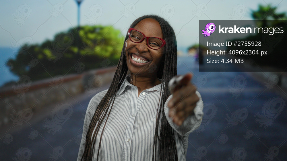 Woman smiling with glasses on a seaside promenade, showcasing joyful expression on a sunny beach day.