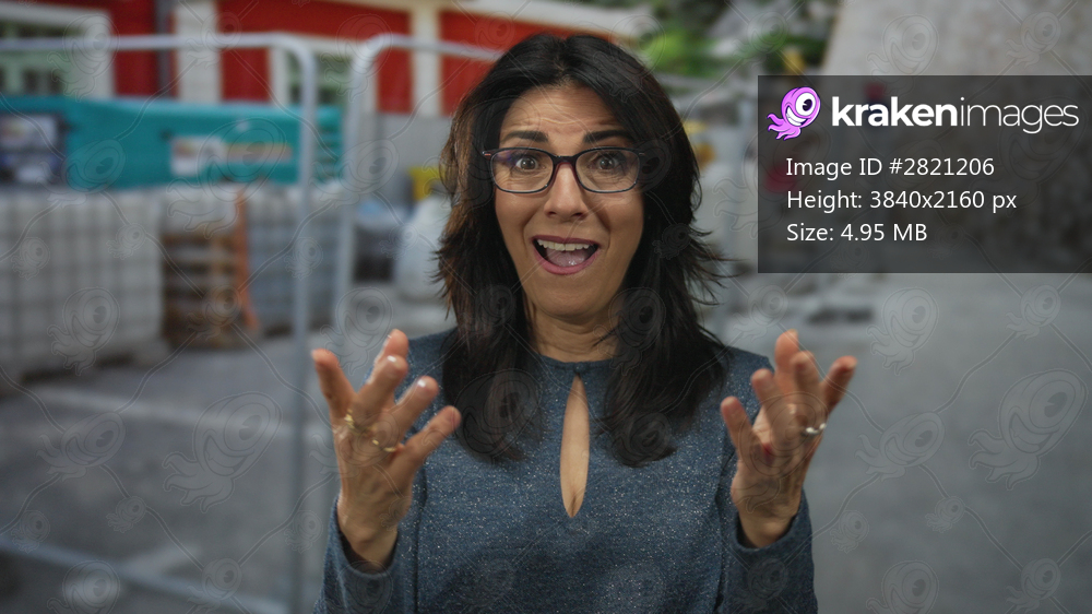 Woman smiling with glasses and patterned blue blouse at construction site surrounded by scaffolding and machinery; unexpected surprise.