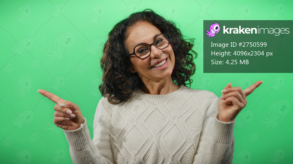 Woman smiling with glasses pointing on a vibrant green background, wearing a cozy sweater, showcasing happy mature hispanic beauty with curly hair.