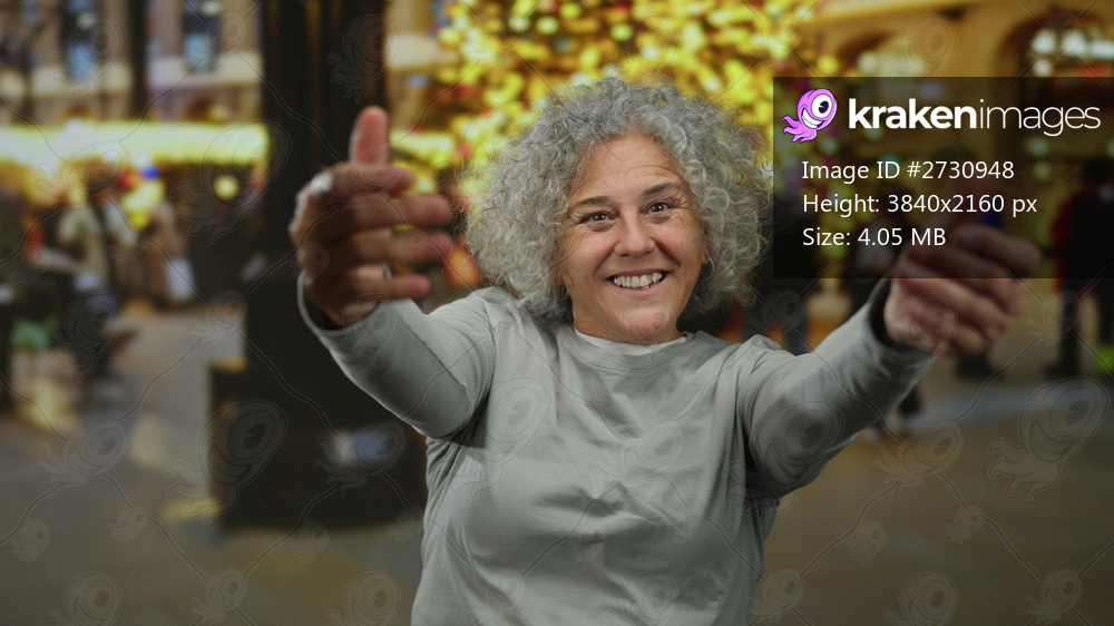 Woman smiling with grey hair in an urban street setting, embracing warmth and joy in a festive city background.