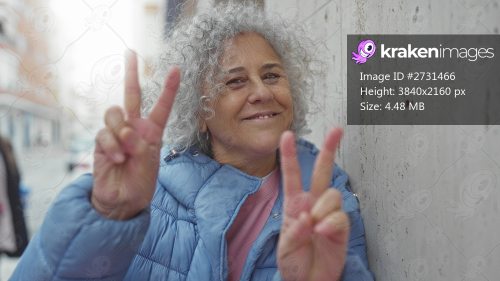 Woman smiling with grey hair making victory gesture on urban street wearing blue jacket.