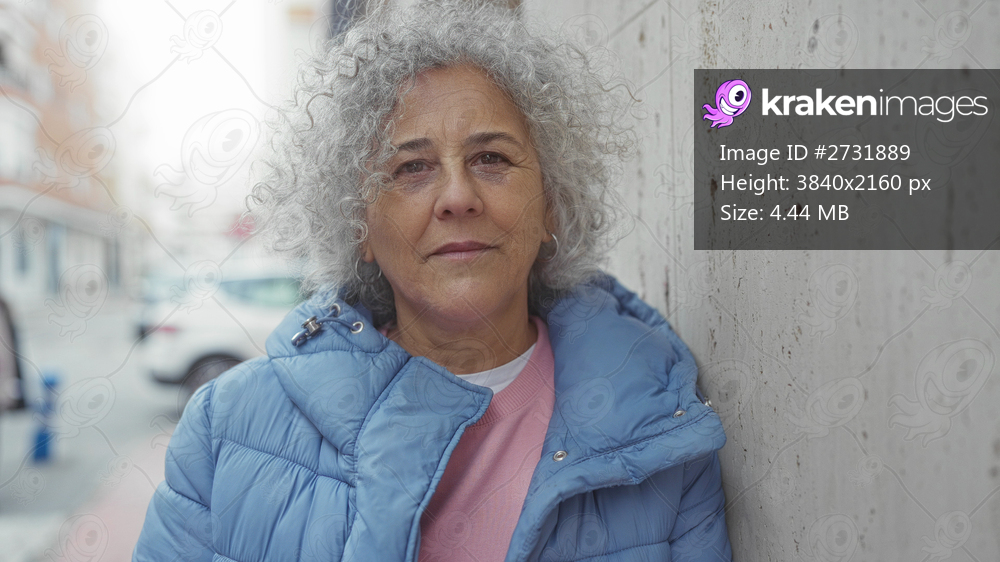 Woman smiling with grey hair making victory gesture on urban street wearing blue jacket.