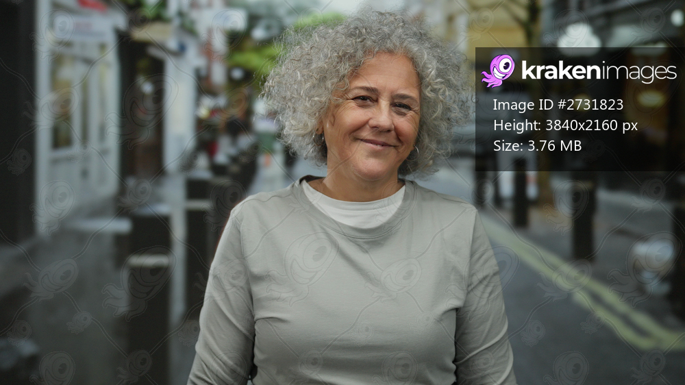 Woman smiling with grey hair standing on an urban street, showcasing middle age contentment in an outdoor city environment.