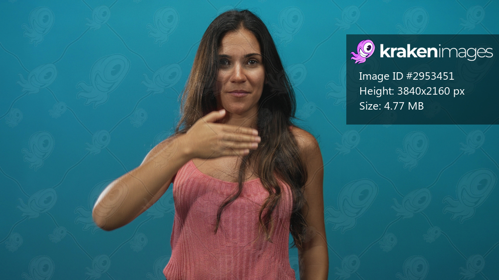 Woman smiling with hand above forehead in teal studio, wearing pink tank top; joy confidence warmth.