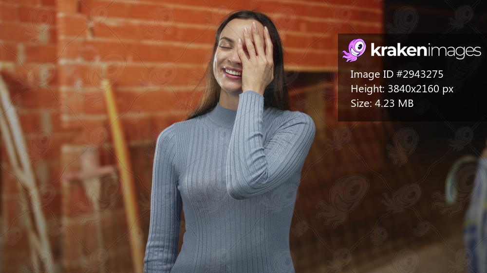 Woman smiling with hand covering face in brick building under construction wearing light blue ribbed sweater, eyes closed in casual pose; joy ease.