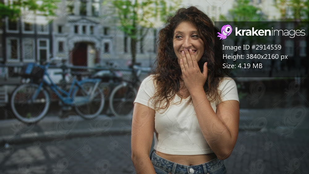 Woman smiling with hand covering mouth on street by canal wearing white crop top showing midriff; joy playfulness.