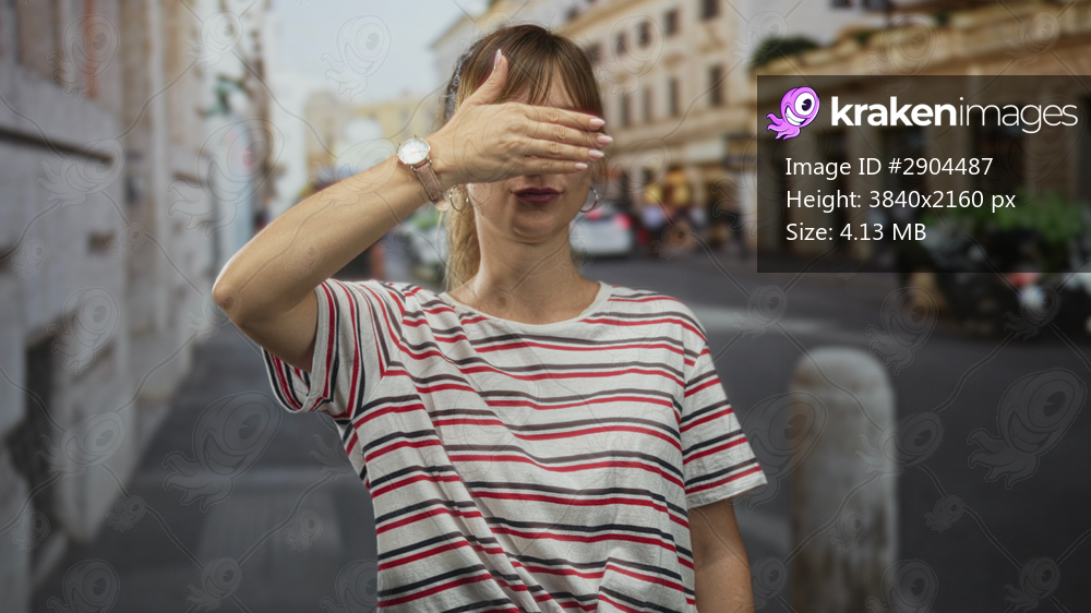 Woman smiling with hand covering mouth, wearing glasses and striped shirt while standing on a busy city street; playful.