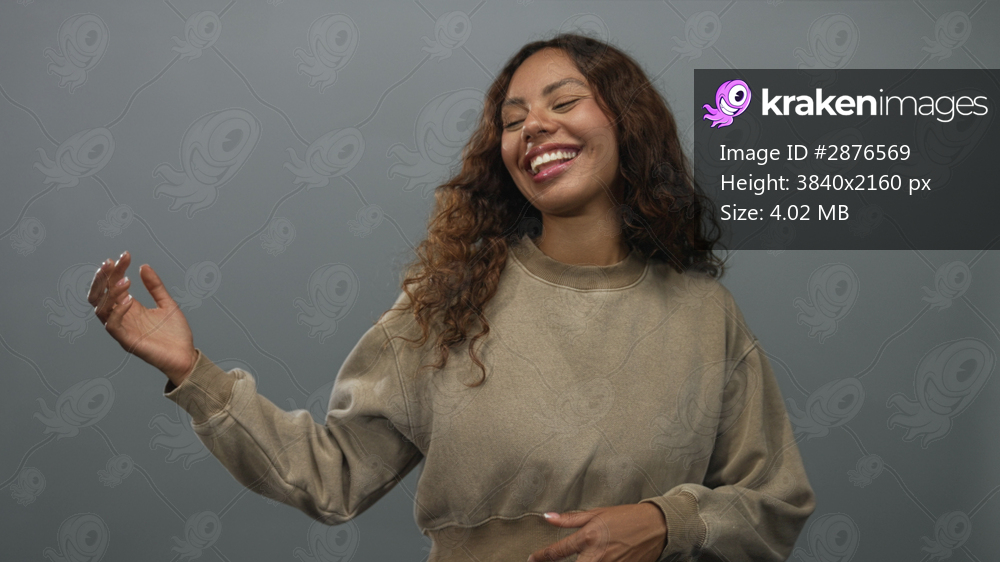 Woman smiling with hand gesture and relaxed pose in gray studio wearing beige sweatshirt and swaying gently; carefree joy.
