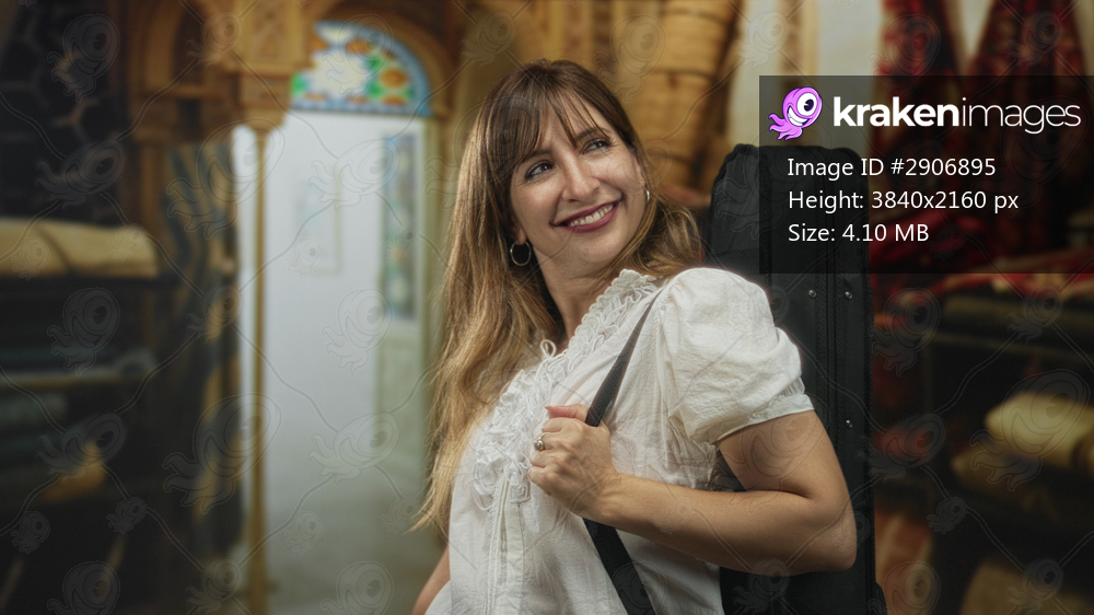 Woman smiling with hand holding guitar case strap on shoulder inside building among rolled carpets in a shop; contentment music travel.