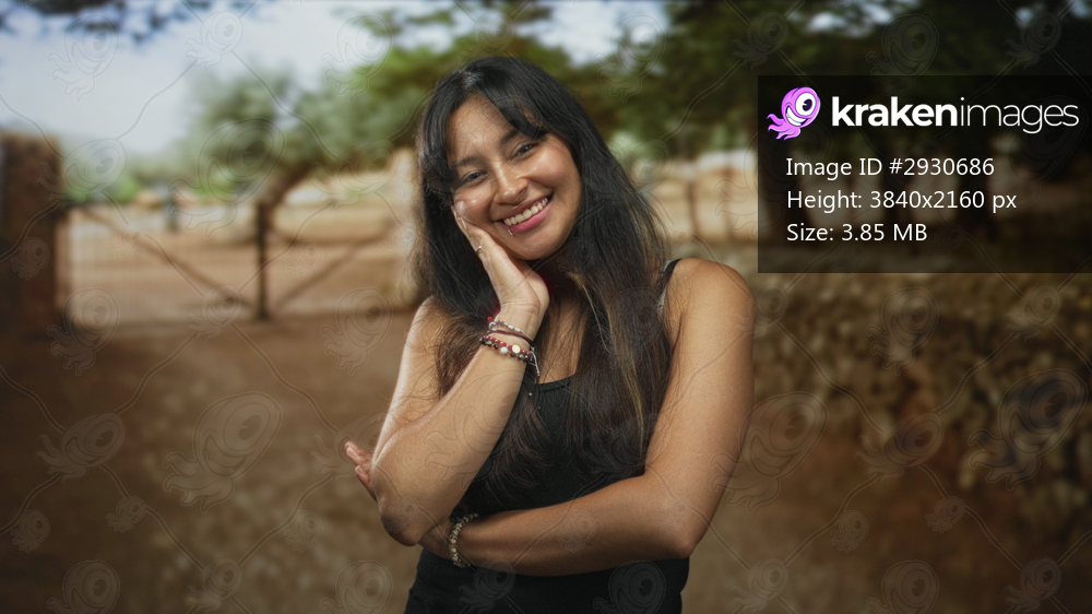 Woman smiling with hand on cheek and long brunette hair in forest gate setting, casual pose and natural sunlight; joy and confidence.