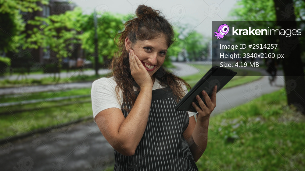Woman smiling, hand on cheek while holding tablet on street in park with green trees and path; joyful surprise.