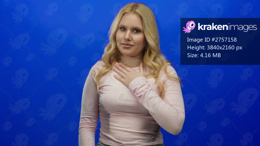 Woman smiling with hand on chest against vibrant blue background, conveying gratitude and positivity.