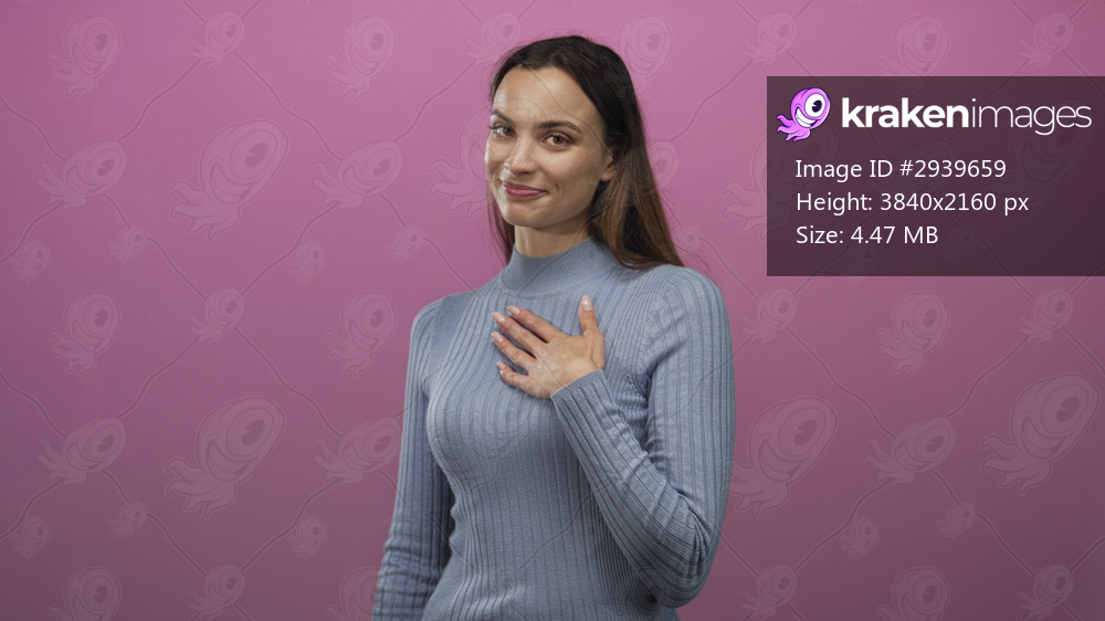 Woman smiling with hand on chest and closed eyes wearing a light blue ribbed sweater in pink studio; gratitude appreciation.