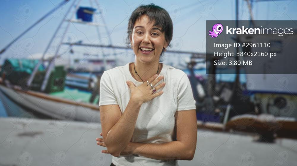 Woman smiling with hand on chest and crossed arm wearing white shirt in studio with boat backdrop; gratitude sincerity.