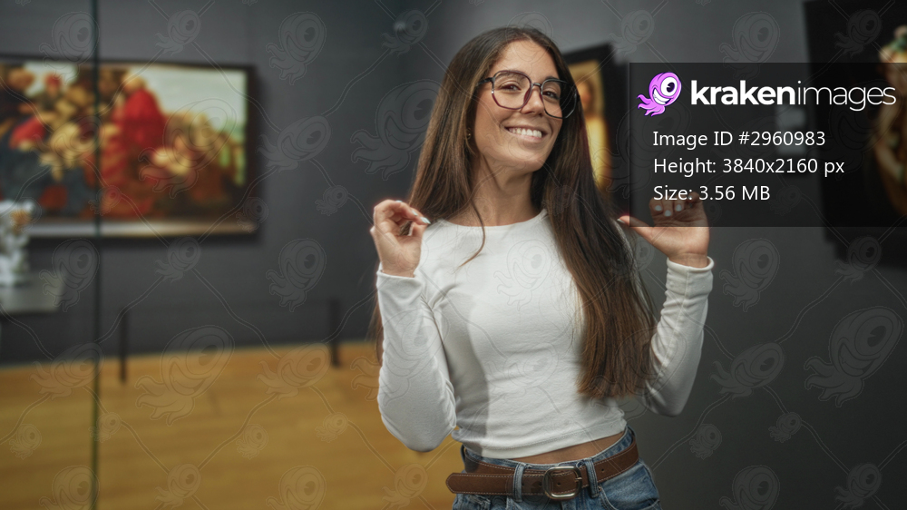 Woman smiling with hand on chest and hand on hip in museum gallery beside framed paintings and wooden floor, wearing glasses and jeans; confidence self expression. - Kraken Images