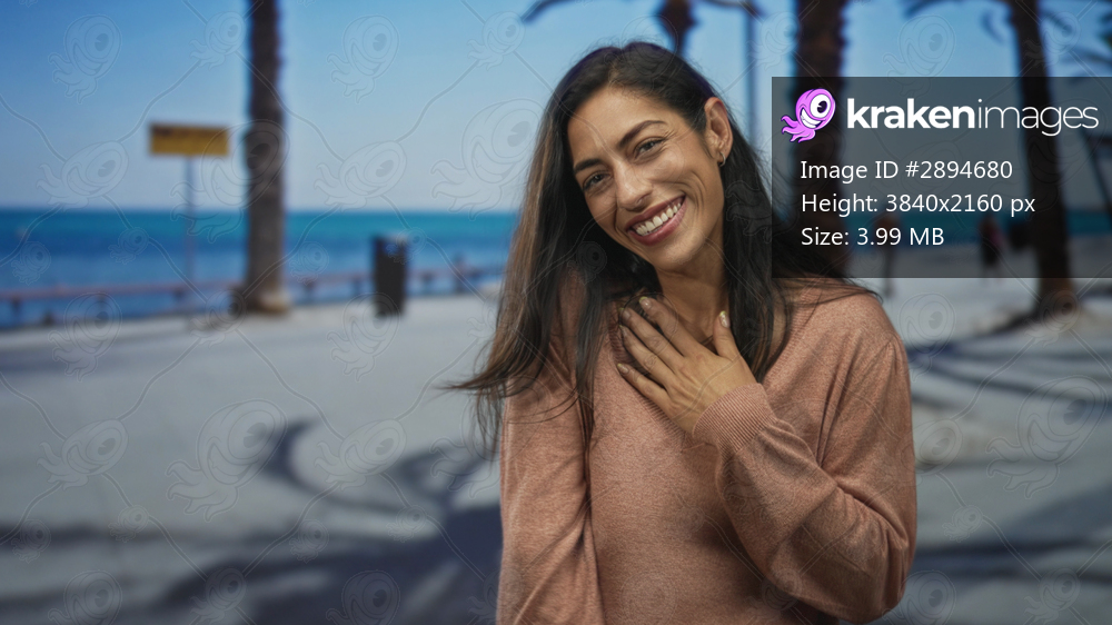 Woman smiling with hand on chest and waving other hand, wearing pink sweater on a sunny seaside promenade street lined with palm trees and ocean view; joy gratitude. - Kraken Images