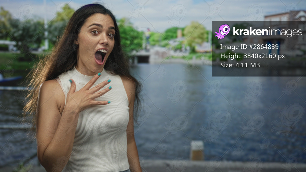 Woman smiling with hand on chest wearing white top beside amsterdam canal water on city street; gratitude.