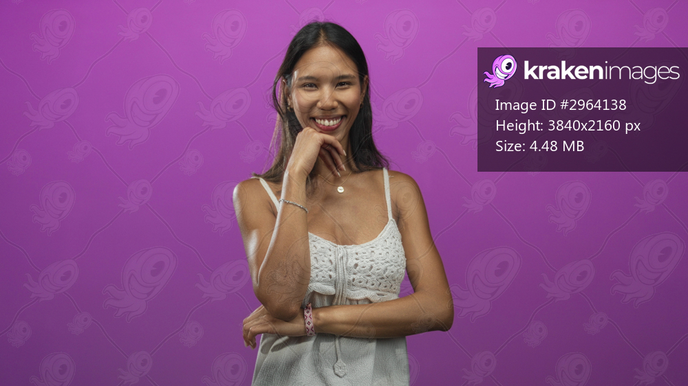 Woman smiling with hand on chin, wearing a crochet white top and pendant necklace in a purple studio backdrop; happiness confidence.