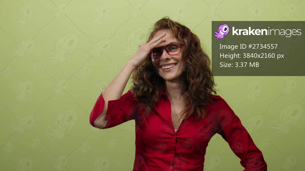 Woman smiling with hand on forehead in red shirt on yellow background radiating joy and happiness with friendly expression