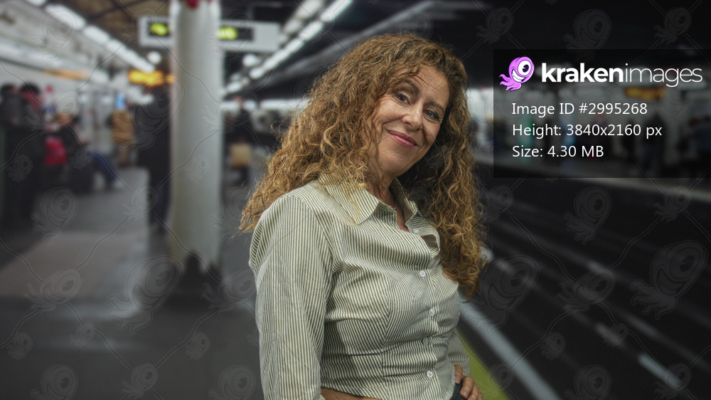Woman smiling with hand on hip and tilted head on an underground subway platform inside a station building, curly hair and casual shirt; confidence commuter. - Kraken Images
