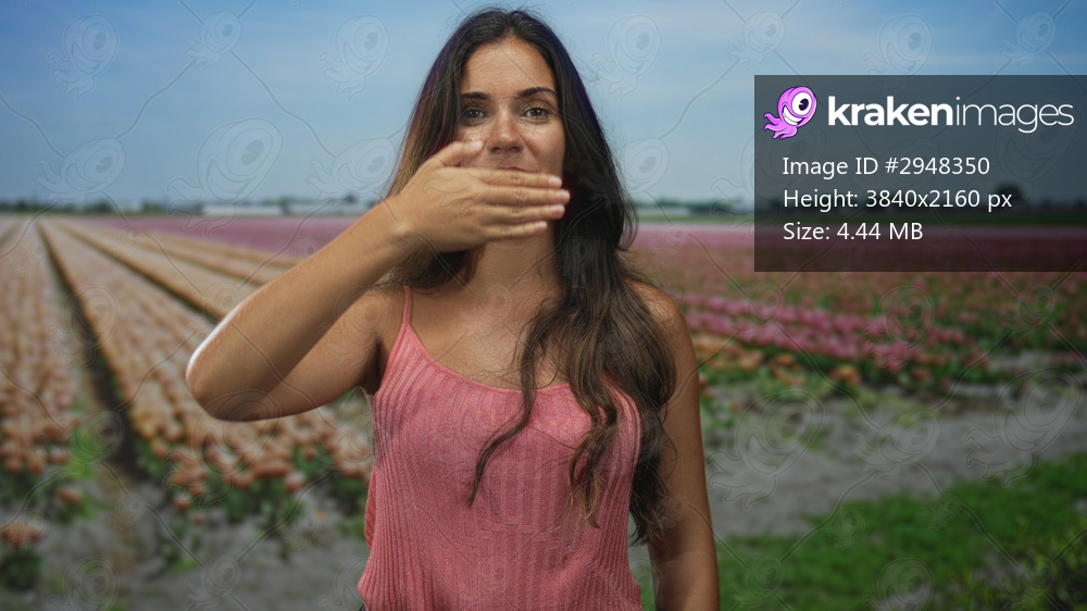 Woman smiling with hand over chest and palm covering eyes in pink flower field studio; serenity connection.