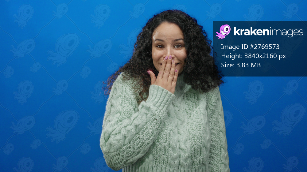 Woman smiling with hand over mouth against vibrant blue background wearing green sweater and curly hair implying surprise and delight in isolated studio setting - Kraken Images