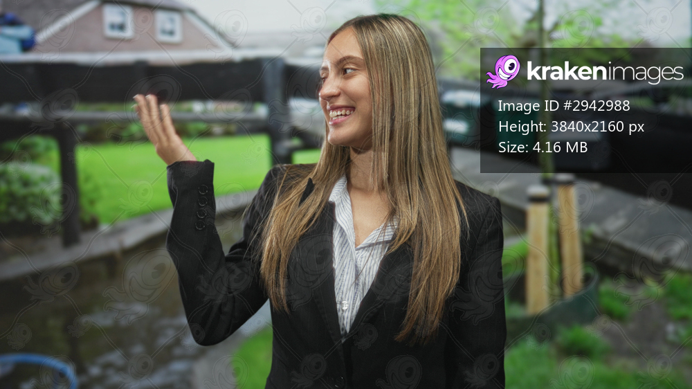 Woman smiling with hand palm up beside a canal railing and grassy towpath, wearing a black blazer and striped shirt, urban waterside setting; playful confidence. - Kraken Images