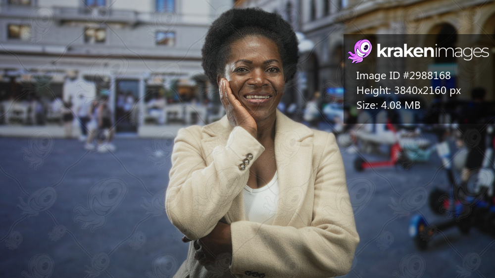 Woman smiling with hand to cheek and arms crossed, wearing beige coat and white top in a busy city street beside electric scooters and stone arches of a plaza; confidence resilience. - Kraken Images