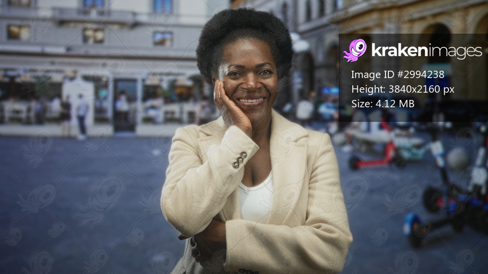 Woman smiling with hand to cheek and arms crossed, wearing beige coat and white top in a busy city street beside electric scooters and stone arches of a plaza; confidence resilience. - Kraken Images